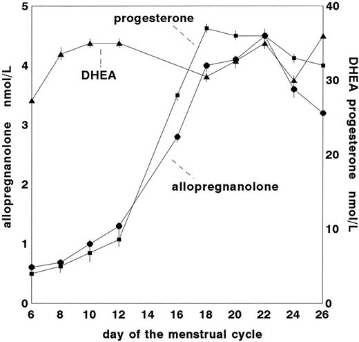Figure 2. Allopregnanolone (•), P (▪), and DHEA (▴) levels during the menstrual cycle, providing that Progesterone is normal).