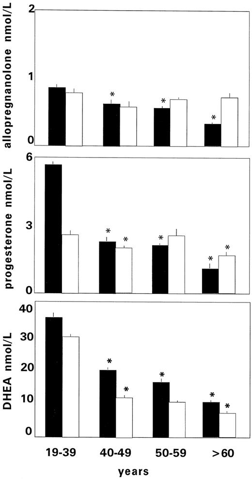In postmenopausal females, Allopregnanolone is at young-male levels, but further age-related reduction is very slow.